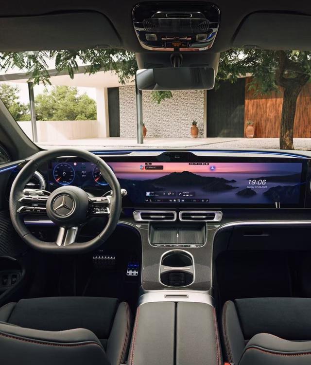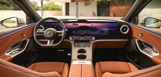 内饰设计最引人注目的是39.1英寸无缝MBUX超联屏,这是奔驰史上最大尺寸的曲面屏,横贯整个仪表台。该屏幕采用创新矩阵背光科技,拥有超1000颗独立LED,带来超清画面与高饱和色彩。同时还具备创新智能分区调光技术,实现一块屏幕两种亮度。车内保留了圆形空调出风口,氛围灯系统可覆盖至空调出风口区域。当调节温度时,出风口灯光会短暂变色,增强了人车交互体验。